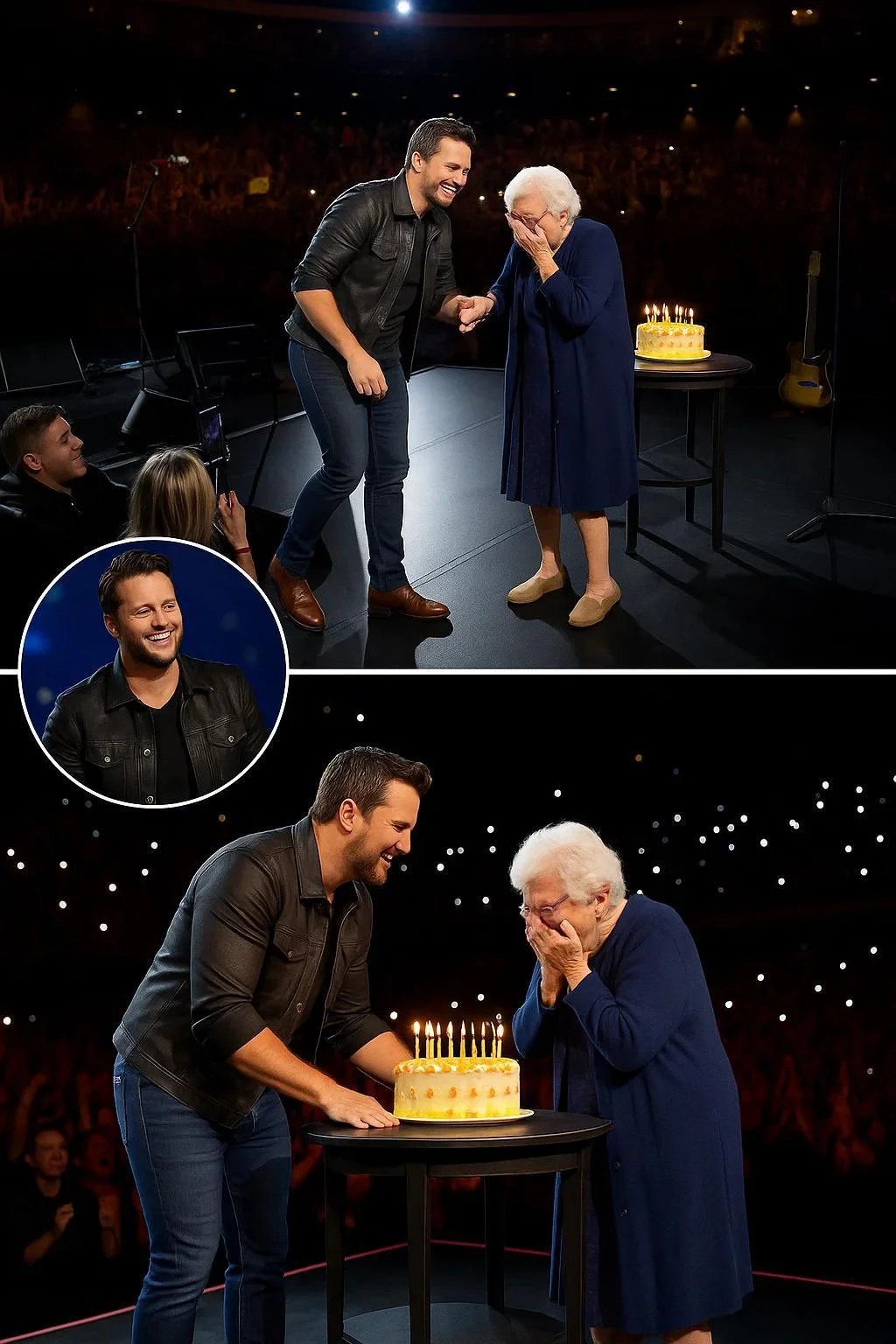 As the band played and the lights pulsed across the arena, Luke unexpectedly paused the show, stepped down from the stage, and gently took the hand of an elderly woman in the front row. The stunned crowd fell silent as he led her toward the spotlight.