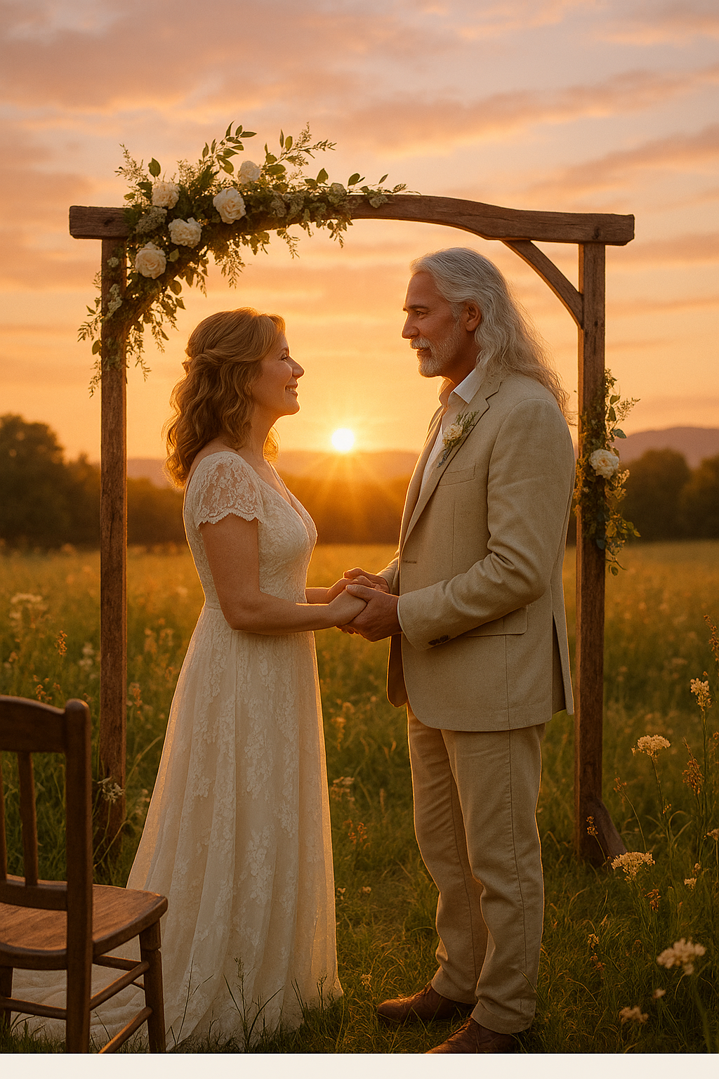 He sees Angie walking toward him slowly, gracefully, wearing a simple white dress, her silver hair catching the afternoon sunlight. In his hands, he holds a guitar—not for performance, but for love. As she approaches, he strums a familiar melody, one only they know, the kind that speaks louder than words ever could.